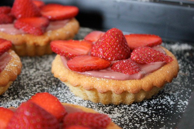Abkühlen und auf den Küchlein verteilen – zur Deko habe ich noch schnell Erdbeeren drauf… fertig… Ihr werdet euch Fragen: Orangenkuchen und Erdbeeren – schmeckt das denn? Ich kann nur sagen: Jipp, auf jeden Fall und alle die davon probiert haben waren auch seeeehr einverstanden.
