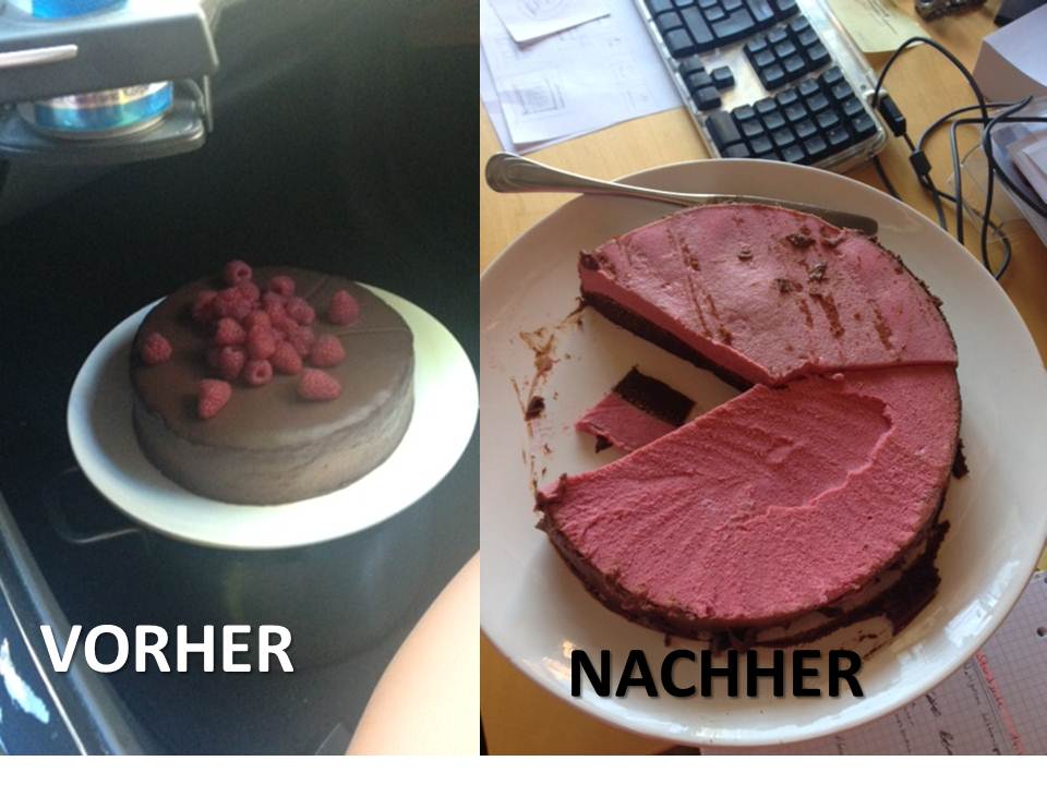 Super Idee – funktionierte auch herrlich auf fast der ganzen Strecke (Gut, die Leute werden gedacht haben ich bin eine scheiss ängstliche Autofahrerin, weil ich im Schnitt maximal 30 gefahren bin, aber das war mir egal). 250 Meter vor der Agentur, Ampel springt auf gelb, Typ vor mir gibt Gas und macht in letzter Sekunde eine Vollbremsung – ich muss natürlich auch voll in die Eisen und der Kuchen flog im Fußraum vornüber gegen die Fußmatte. Was davon übrig geblieben ist kann man auf dem Foto ja ganz gut erkennen – ich war so geschockt, dass ich es versäumt habe auszusteigen um den Typen ordentlich zu vermöbeln. Nach dem Schock war ich sooo sooo sooo traurig – mir ist sogar ein Tränchen gekommen… die ganze Arbeit umsonst 😦 Ich rettete was nicht irgendwelchen Fusseln zum Opfer geworden ist und ich muss sagen, geschmacklich trotzdem gut, aber…. ach lassen wir das….