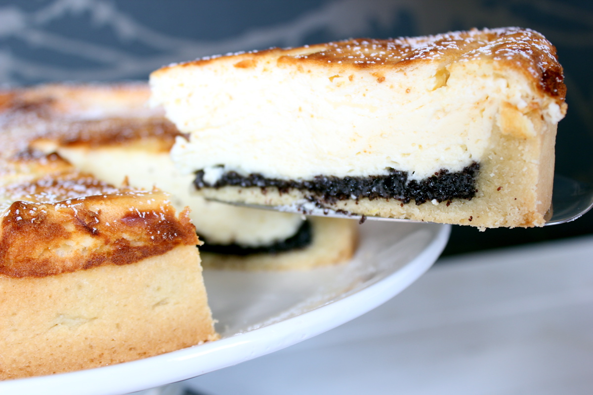 Nun den vorgebackenen Mürbeteig mit der Mohnmasse bedecken, Quarkmasse darübergeben und bei 160 Grad Umluft im Backofen auf der unteren Schiene für 40 Minuten backen. Sollte der Kuchen jetzt noch nicht bräunlich ist von oben – ruhig noch für weitere 5 Minuten auf der oberen Schiene backen lassen.
