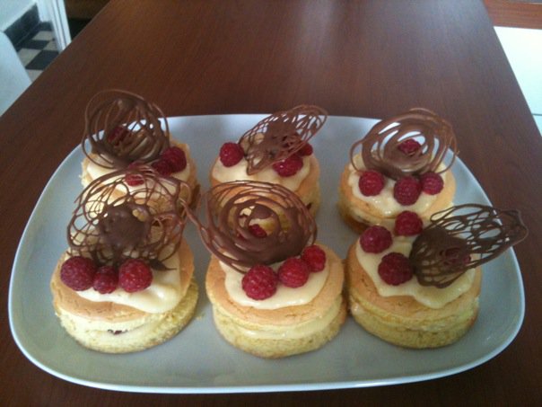 Nun schichten wir: unten einen Biskuitboden, dann in der gleichen Größe vom Himbeergelee eine Schicht ausstechen und darübergeben, eine Schicht Vanillepudding und als Deckelchen einen zweiten Biskuitboden. Am Besten funktioniert das eben nur mit der Benutzung eines Dessertringes da der Vanillepudding irgendwie stabilisiert werden muss. Obenauf einen Klecks Vanillepudding und mit Himbeeren dekorieren – fertig. Das ganze sollte 3-4 Stunden kaltgestellt werden, bevor ihr den Dessertring wieder löst.