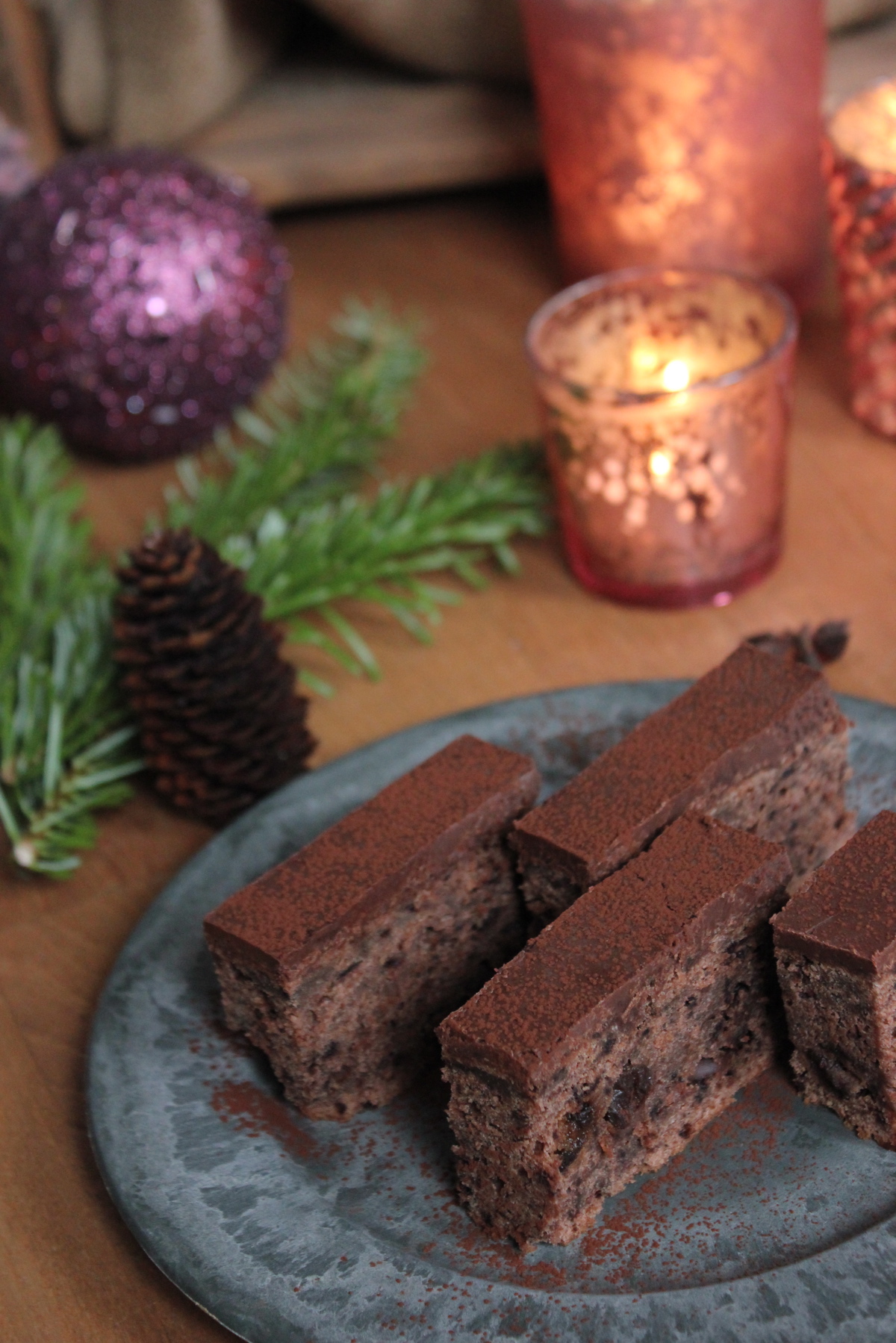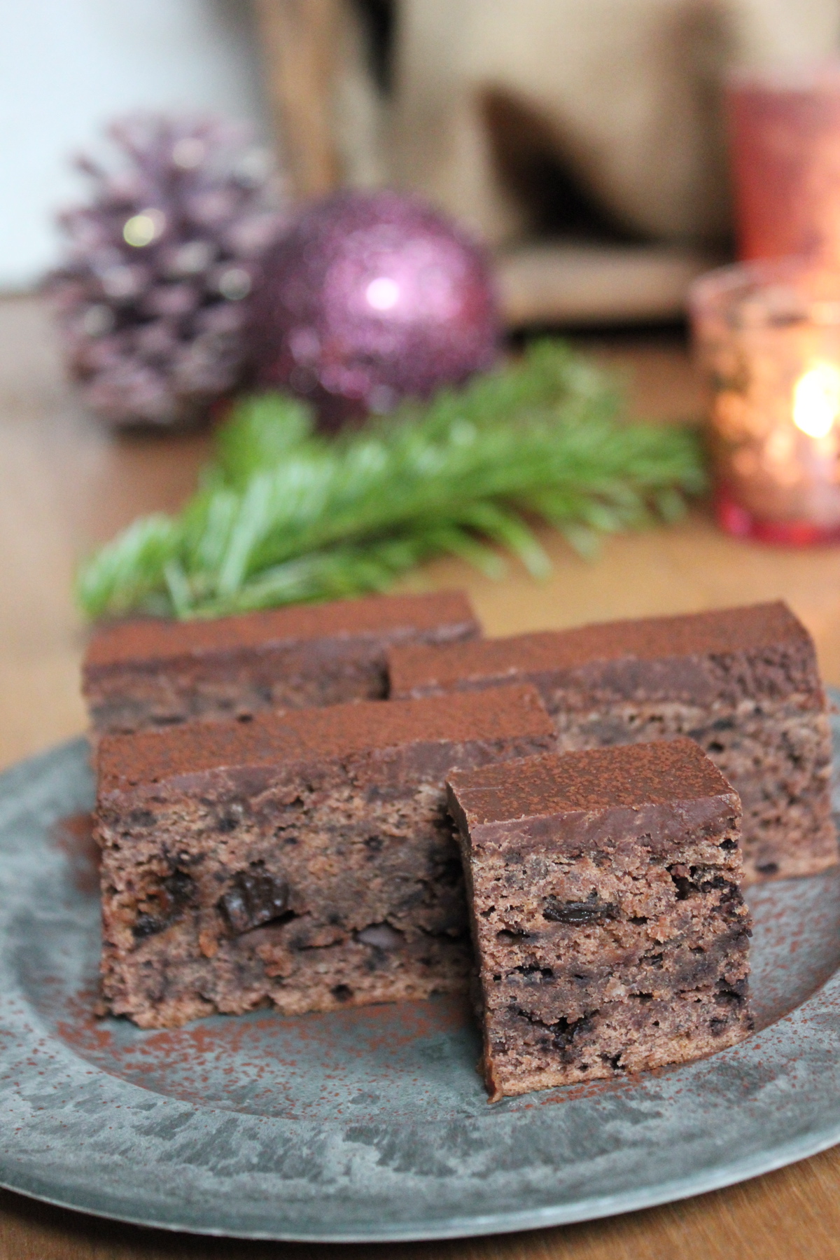 Der Kuchen ist dank der reifen Bananen herrlich saftig und schmeckt auch nach 4 Tagen noch sehr, sehr saftig. Auf den Fotos sieht der Kuchen recht „kompakt“ vom Teig her aus – das liegt daran, dass er bereits vier Tage stand und schon gut Luftfeuchtigkeit gezogen hatte (ja, wir hatten schlechtes Licht die letzten Tage… mein armer Mann bekam ständig auf die Finger, wenn er sich ein Stück stibiezen wollte :)). Schneidet den Kuchen in kleine Würfel und reicht sie als Weihnachtskonfekt – auch ganz lecker.