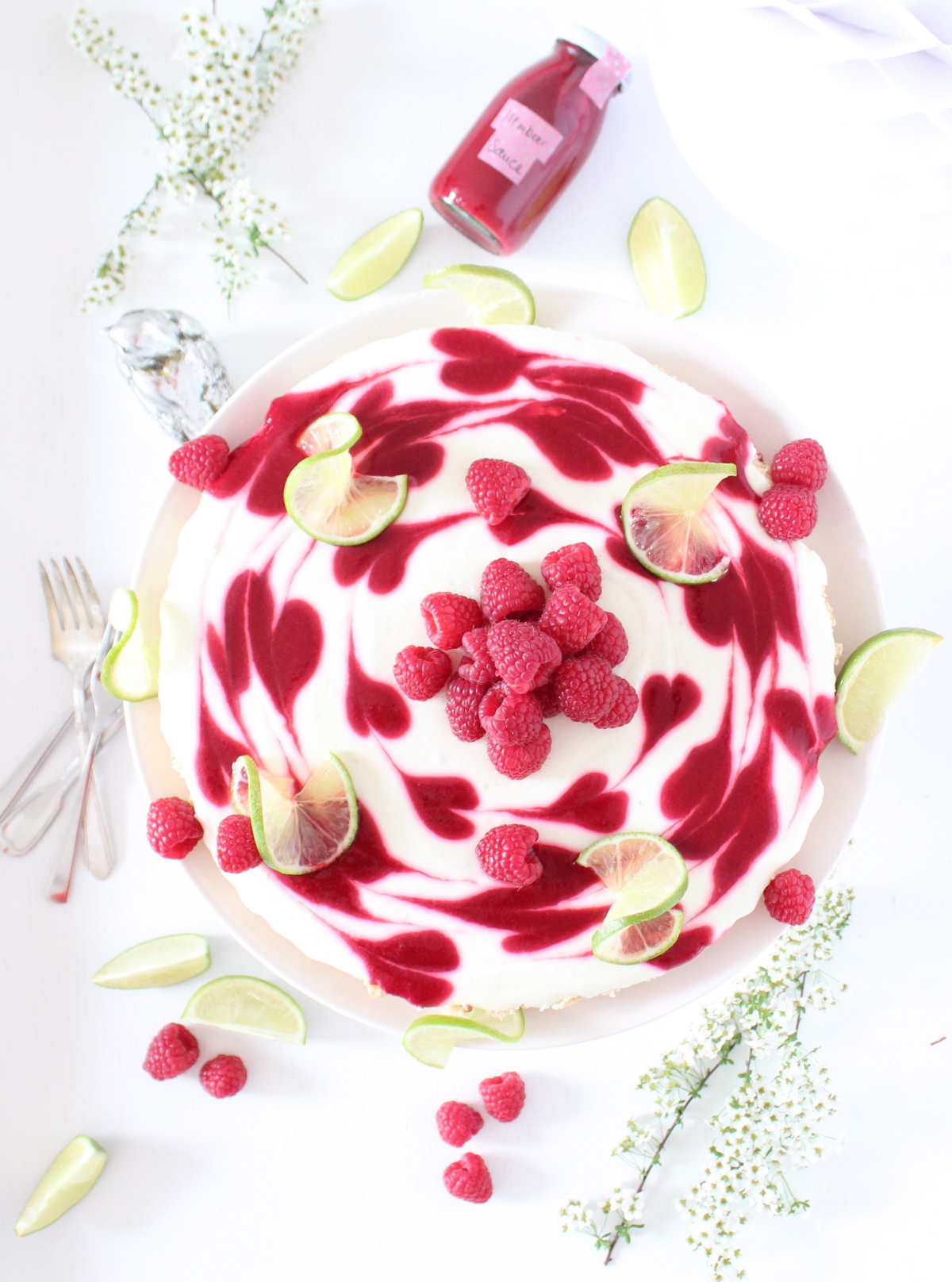 8. Mit Himbeeren und Limettenscheiben nach Belieben dekorieren.
